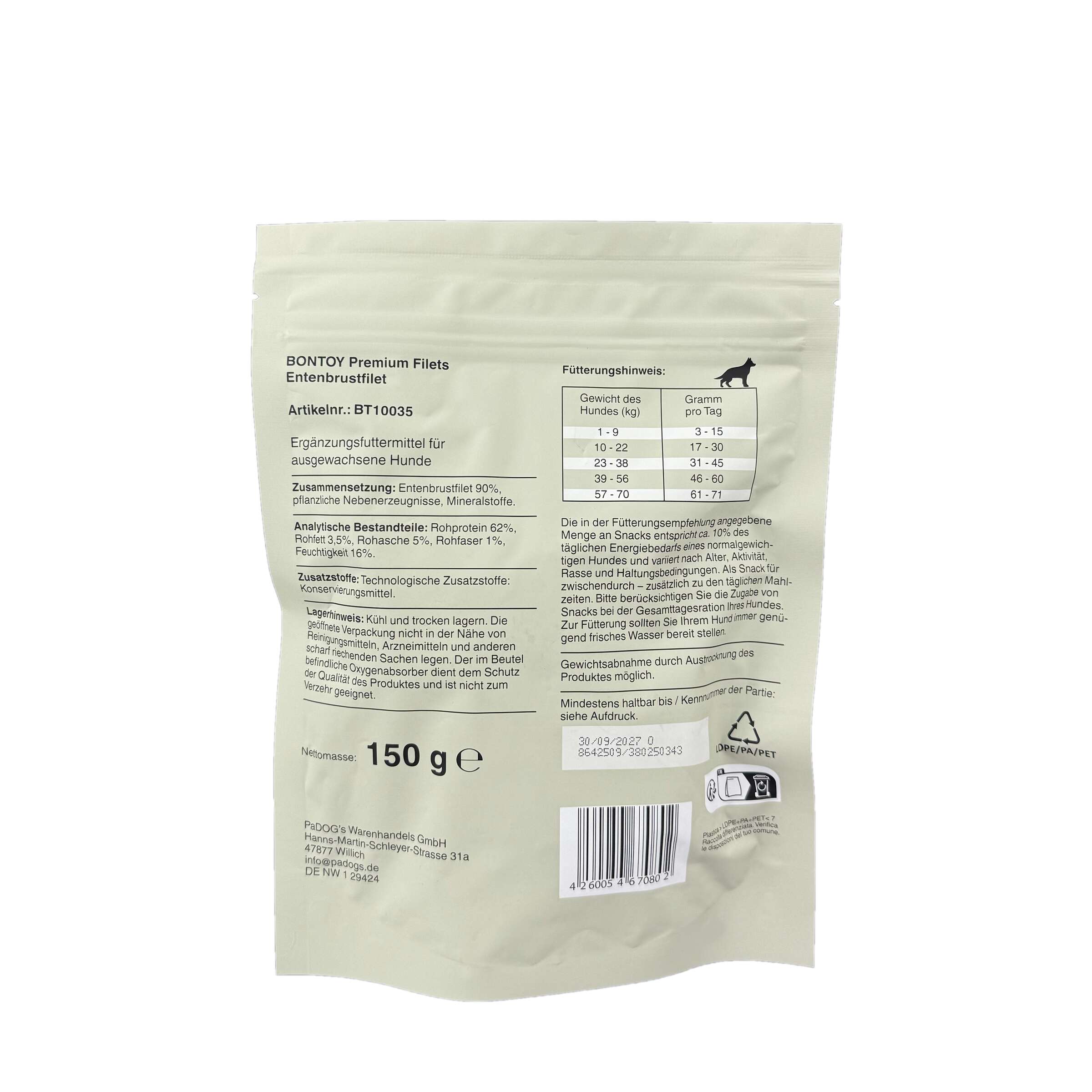 Zusammensetzung: 90% Entenbrustfilets, Stärke
